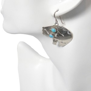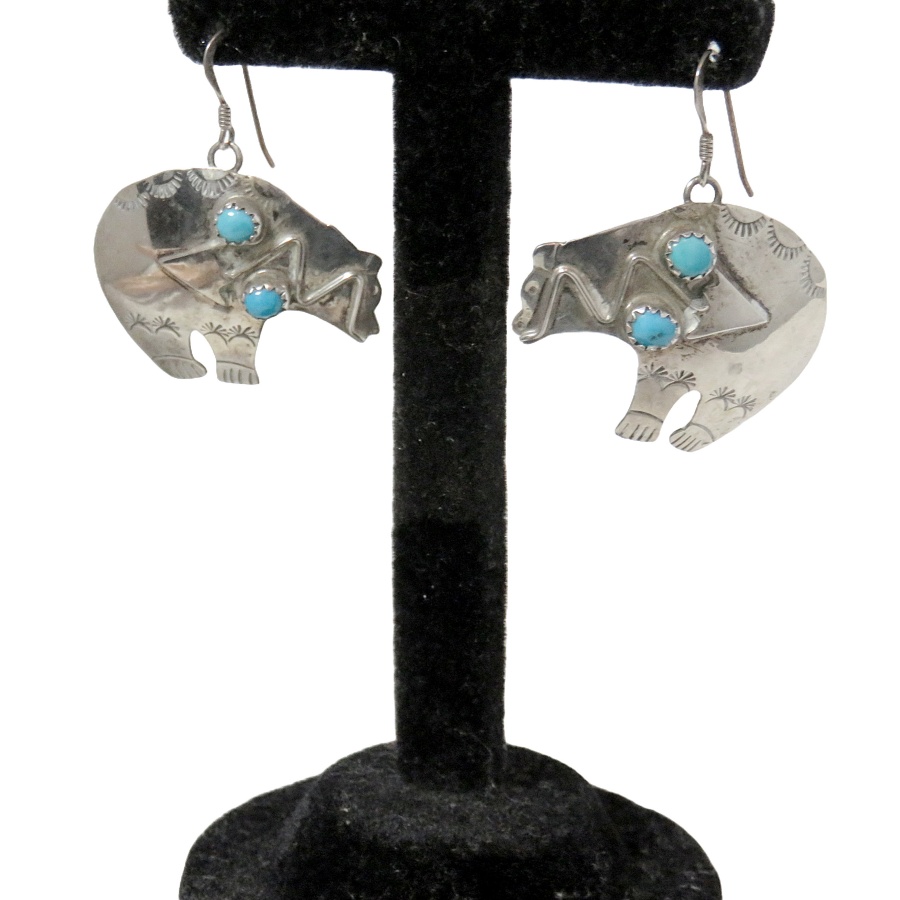 Fraaie en grote sterling (= 925) Navajo Indiaanse zilveren beer oorbellen met ronde turquoise cabochons. Deze vintage oorbellen zijn handgemaakt door Jeff Largo te New Mexico. Het hart van het Zuid Westen. De beer zou volgens de Navajo cultuur een sterke beschermende functie hebben. Ze dragen zeer comfortabel en wegen samen 8,1 gram.