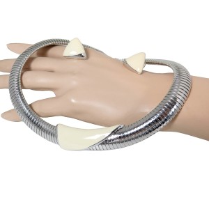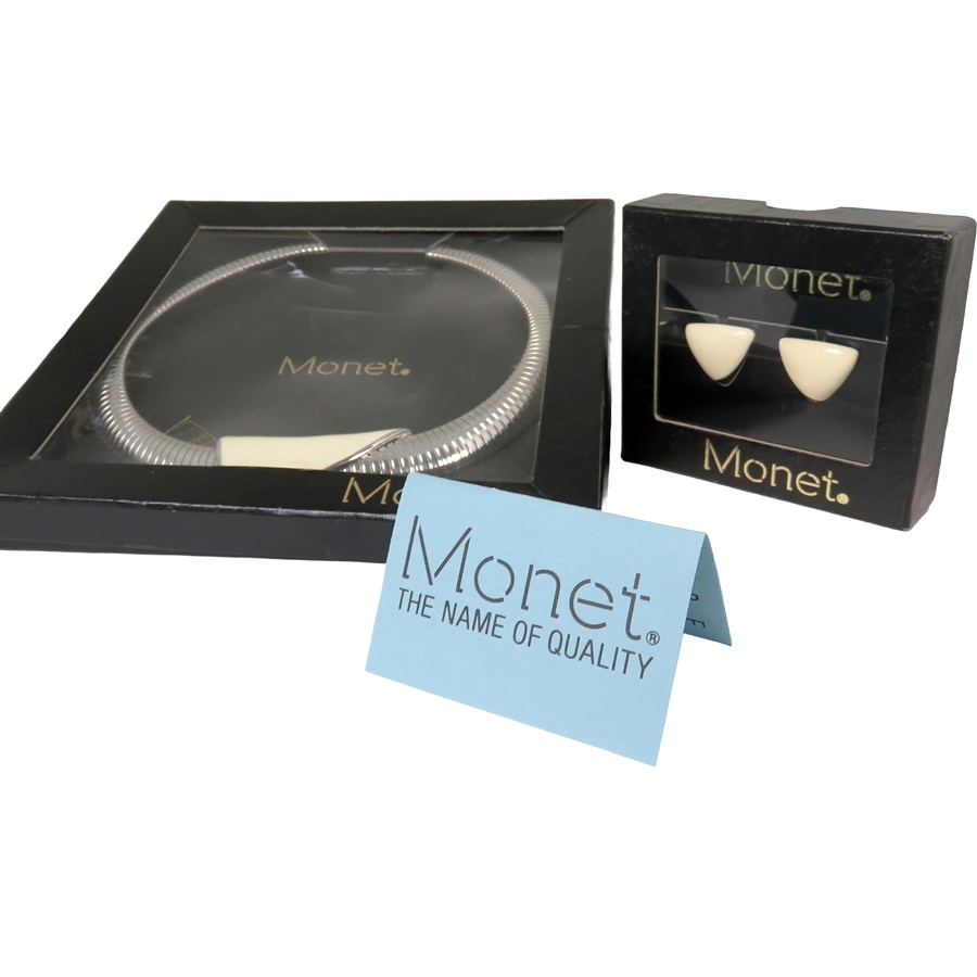 Bijzondere zware kwaliteit vintage Monet designer collier / choker met bijbehorende steek oorbellen. Het collier bestaat uit een brede, zilverkleurig slangen (omega) ketting met een driehoekig gevormd siergedeelte met beige kleurig emaille. De driehoekige zilverkleurige oorstekers zijn ook voorzien van beige emaille. Deze set heeft een prachtige klassieke chique uitstraling en komt in zijn originele dozen. Het plastic van de deksel van de doos met het collier heeft lichte beschadigingen. Het collier valt soepel om de hals. Zeer stijlvol! De oorbellen wegen 10,5 gram samen en het collier weegt 70,3 gram. Design uit de 80er jaren.