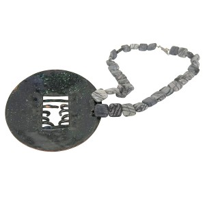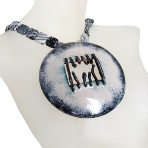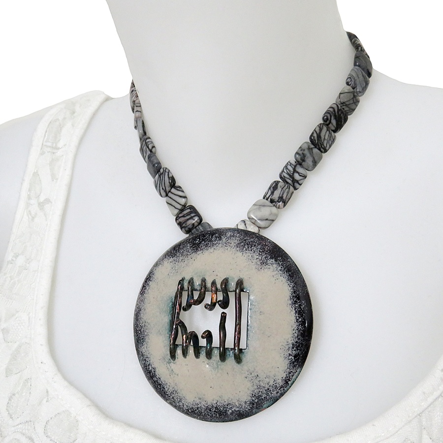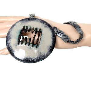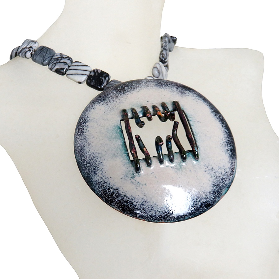 Mooie handgemaakte brutalistische - modernistische vintage natuurstenen ketting met een grote hanger met kunstig emaille. Deze modernistische hanger is prachtig sculpturaal vormgegeven in de zo typerende stijl uit de 60er - 80er jaren. De ronde hanger is gemaakt van koper dat aan beide zijden is voorzien van emaille. Het geheel weegt 88 gram.
