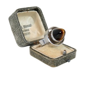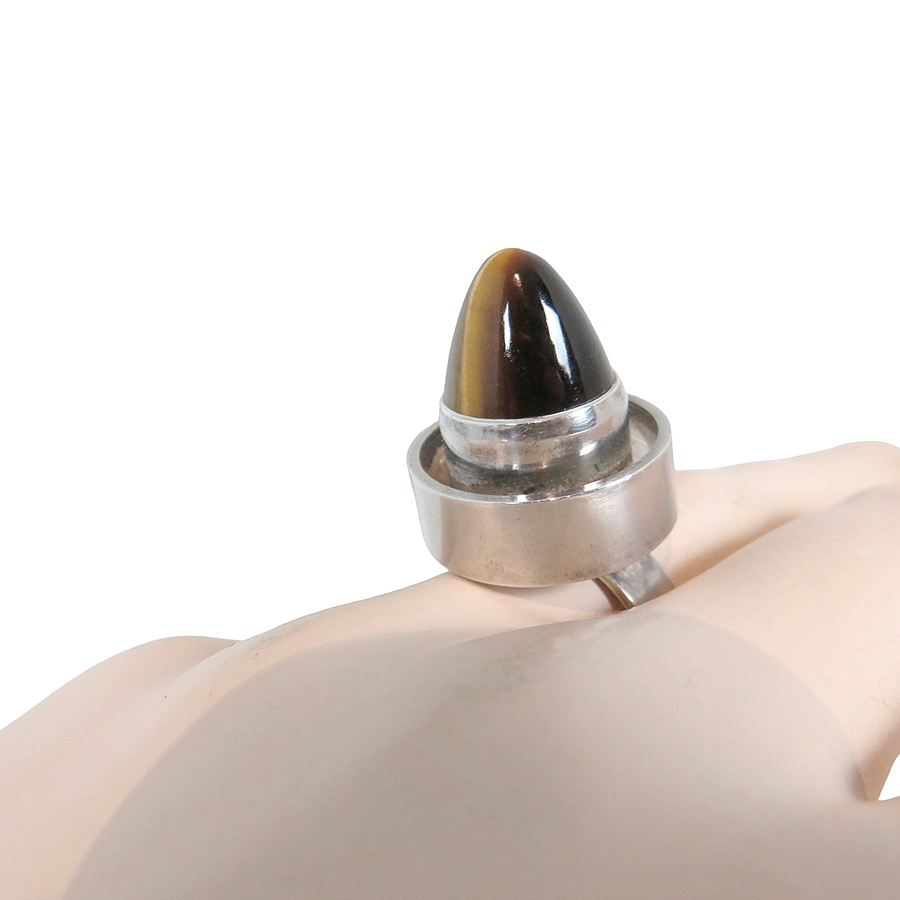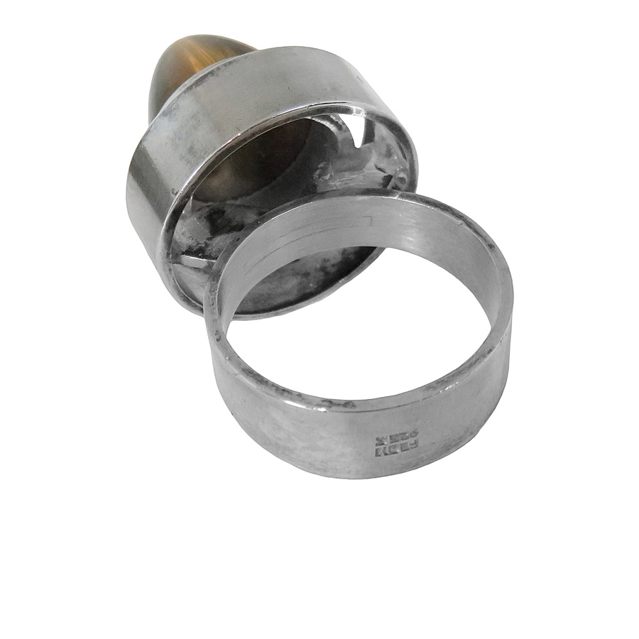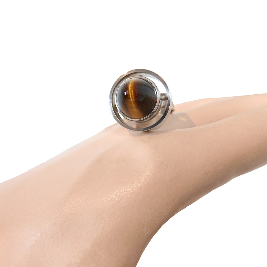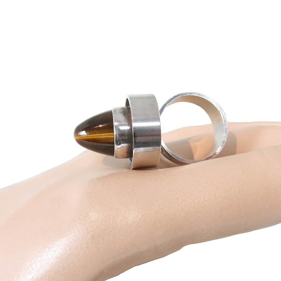 Zeldzame en prachtige modernistisch 925 zilveren ring van de Deense top designer Niels Erik From. Prachtige handgemaakte ring met een natuurlijke conisch geslepen tijgeroog steen. De ring weegt 13,5 gram en dateert uit de 60er/70er jaren. Het is een echte showstopper en een prachtige sculpturale ring.