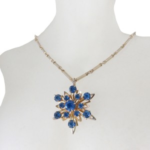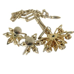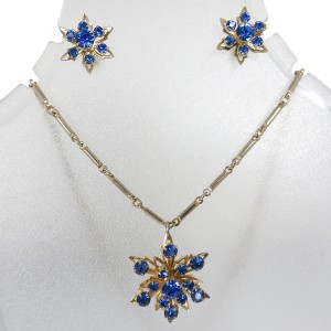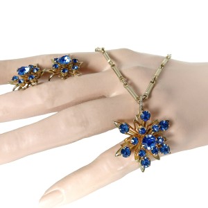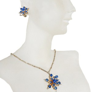 Vintage Coro (Amerika) designer collier met schroef oorbellen. De set is gemaakt van goudkleurig metaal met verfijnde uitgewerkte bloemen met blauwe rhinestones. Art Deco geïnspireerd Costume design uit de 50 - 60ér jaren. Het gezamenlijke gewicht bedraagt 22,4 gram.