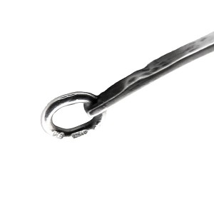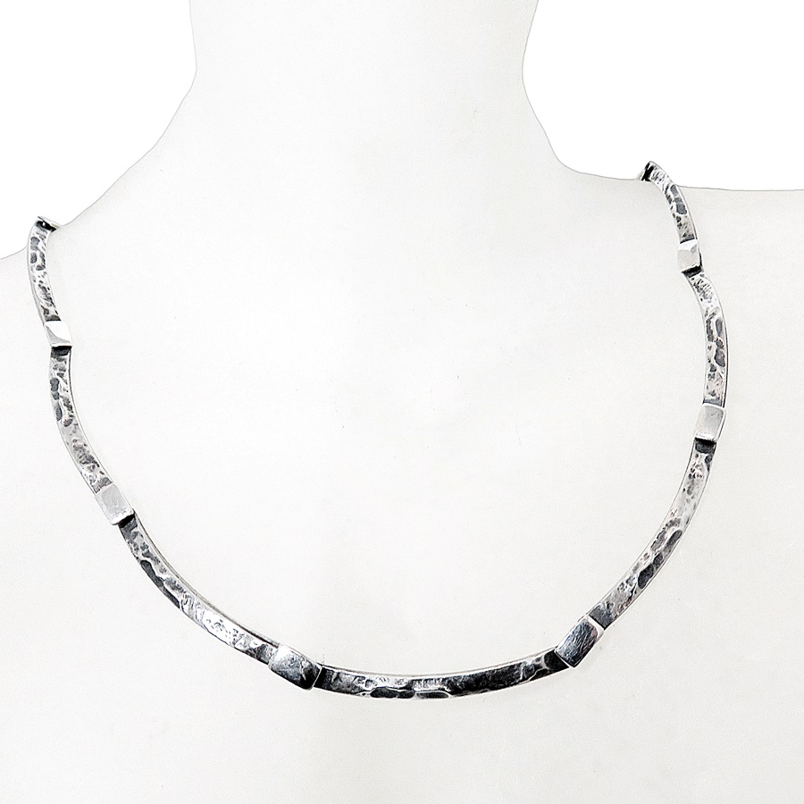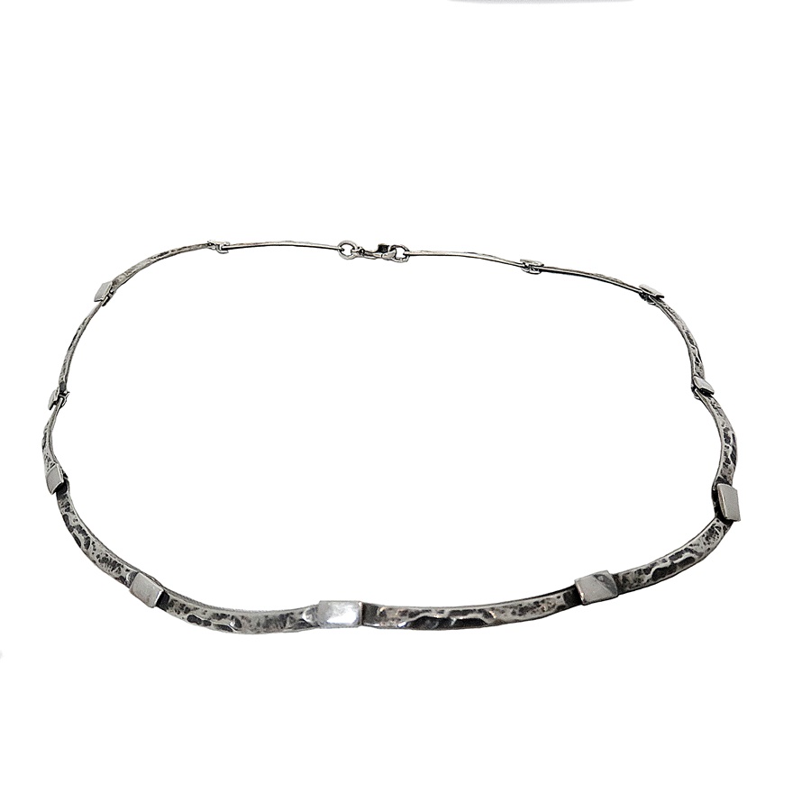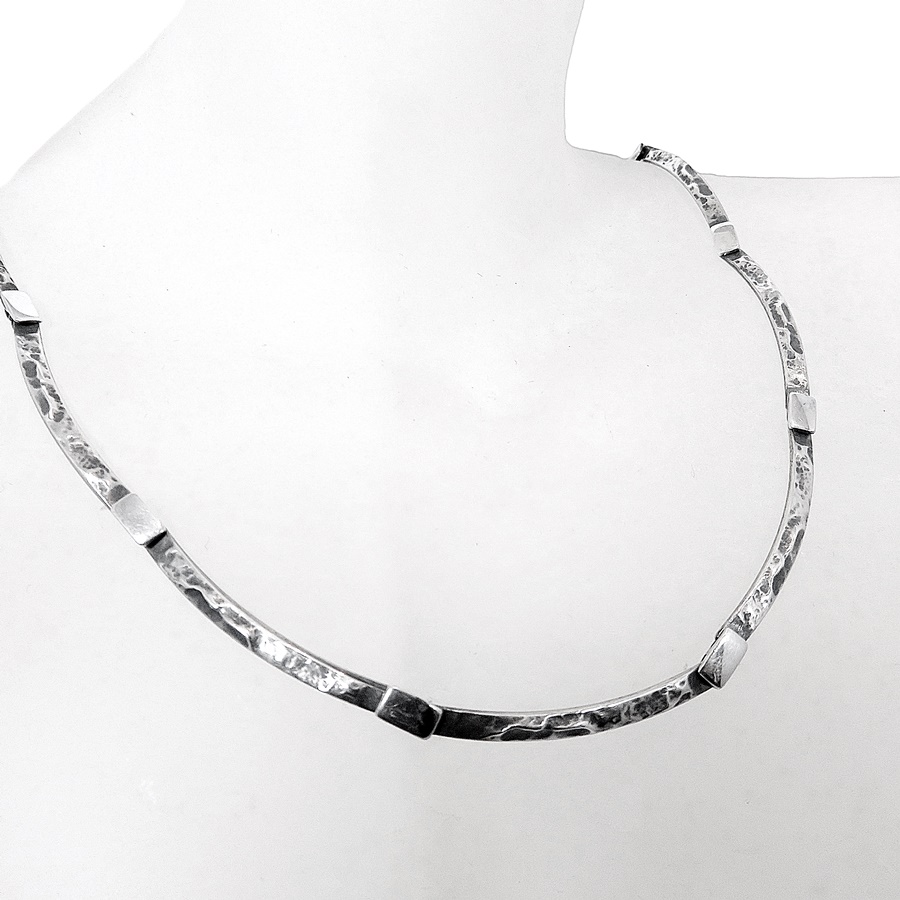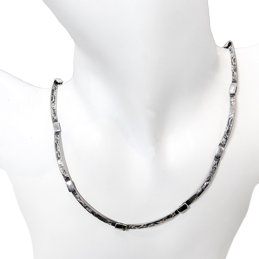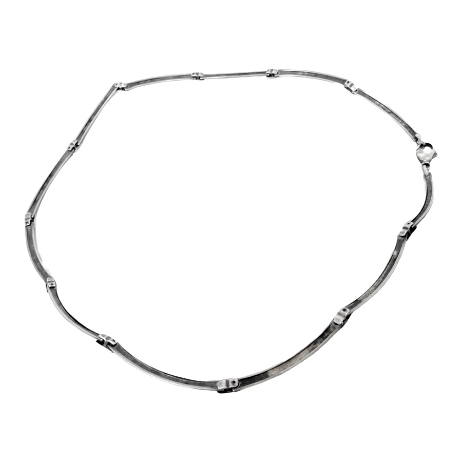 Prachtig vintage handgesmeden 925 zilveren choker collier. Deze bijzondere en tijdloze ketting heeft 12 reliëf schakels. Iedere modernistische schakel heeft een glanzend verbindingsdeel. Het doet wat Scandinavisch aan. Een mooi robuust dun soepel vallend collier. Het gewicht bedraagt 12,8 gram.