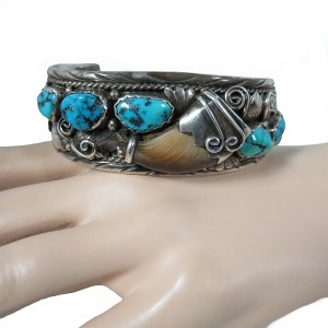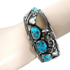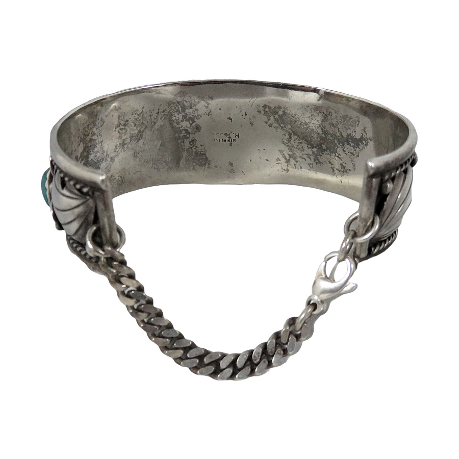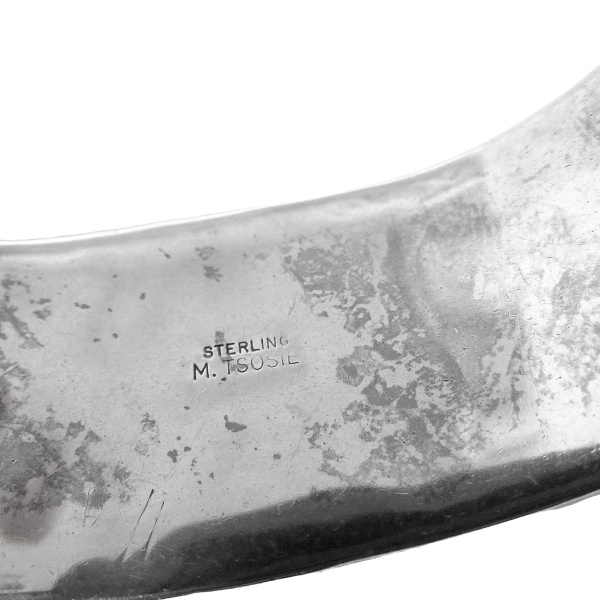 Fantastische vintage originele Navajo Native American berenklauw klem armband, voorzien van een veiligheidsketting. Zeer mooie, massieve en robuuste handgemaakte 925 zilveren manchetarmband met prachtig natuurlijk turkoois. Aan de achterkant gesigneerd met sterling en M. Tsosie (Marie Tsosie). Geschikt voor zowel mannen als vrouwen. Indien nodig kan de bangle voorzichtig worden bijgesteld (door een juwelier). Het gewicht is 66,2 gram.