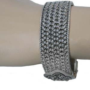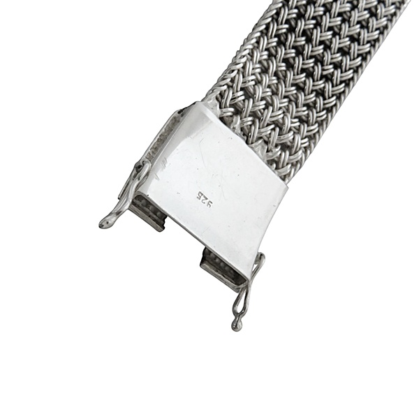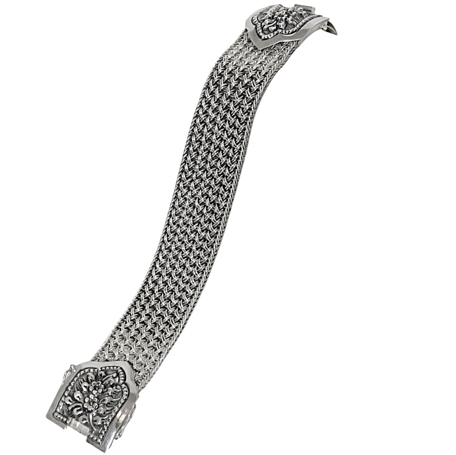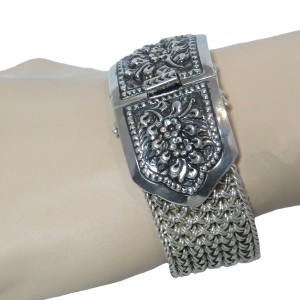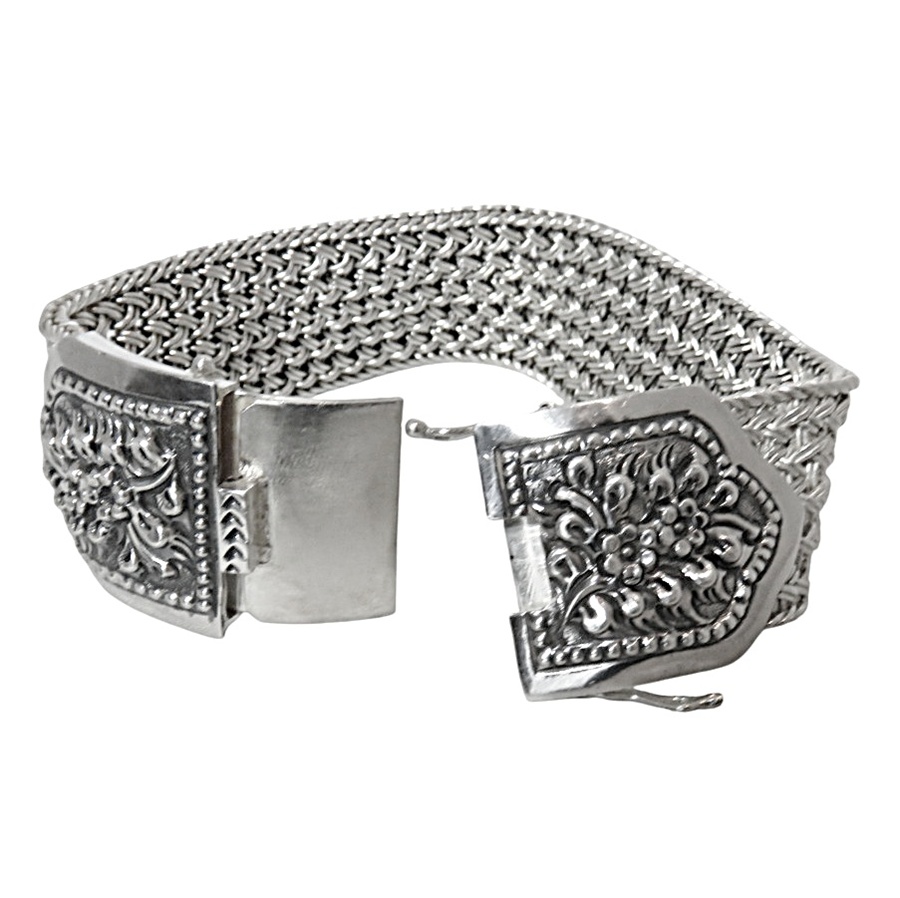 Massieve brede 925 sterling zilveren armband met een breed slot met florale motieven. Deze brede verfijnde armband met vlechtwerk in de band sluit met een goed werkend bakslot en twee veiligheidspinnen aan beide kanten van het slot. Het gewicht bedraagt 88,8 gram. Een stevige sierlijke armband met een mooie patina en glans.