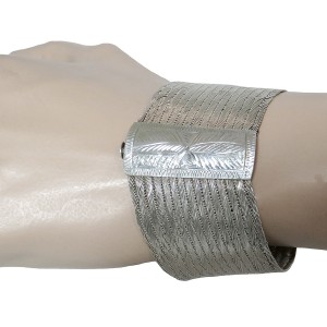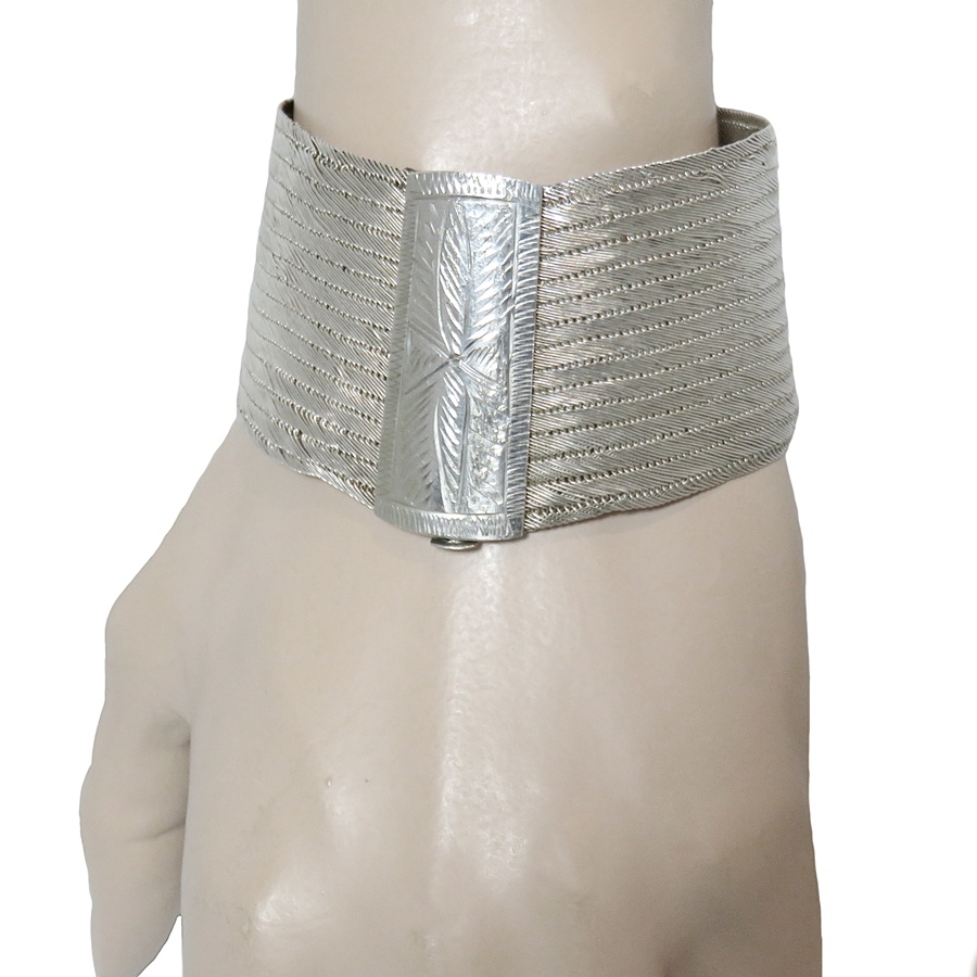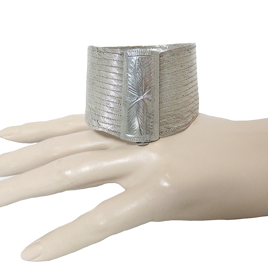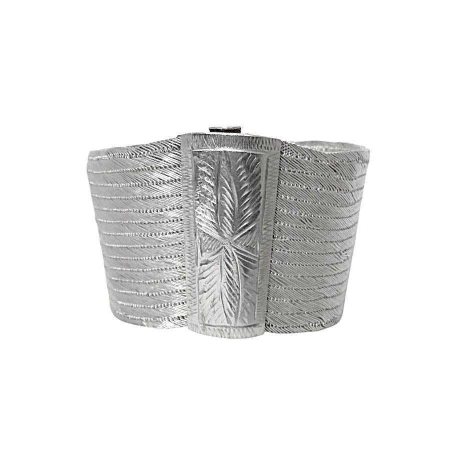 Bijzondere Tribale handgemaakte brede 900 zilveren armband. Deze brede verfijnde filigrain zilveren armband sluit met een goed werkend pinsluiting. Het slot is versierd met een gravering en in de lengte loopt de armband iets schuin. Mogelijk omdat deze dan ook wat hoger op de arm gedragen kan worden, Het gewicht bedraagt 44,9 gram. Een sierlijke armband met een mooie patina en glans.