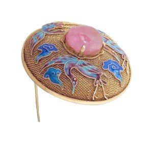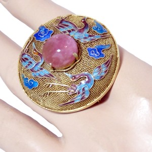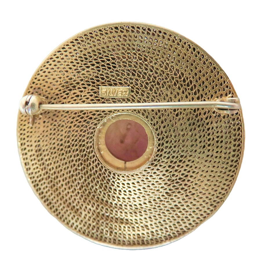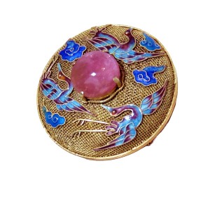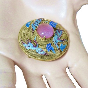 Prachtige en zeldzame Chinese vergulde (vermeil) filigrain zilveren broche met een ronde cabochon geslepen rozenkwarts en zeer verfijnde emaille kraanvogels. Het is handgemaakt door een zeer ervaren zilversmid in de twintiger of veertiger jaren en in prachtige staat. Het heeft een veiligheidssluiting en weegt 13,3 gram.