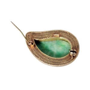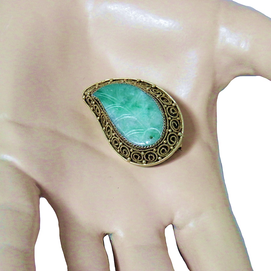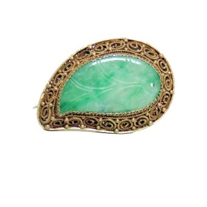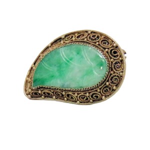 Prachtige Chinese vergulde (vermeil) filigrain zilveren broche met een hand geslepen en ingegraveerde Jade blad en zeer verfijnde rand. Het is handgemaakt door een zeer ervaren zilversmid in de twintiger of veertiger jaren en in prachtige staat. Het heeft een veiligheidssluiting en weegt 9,3 gram.