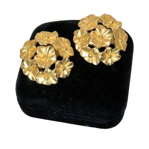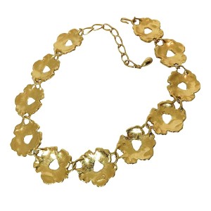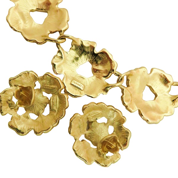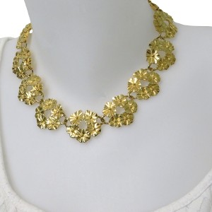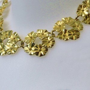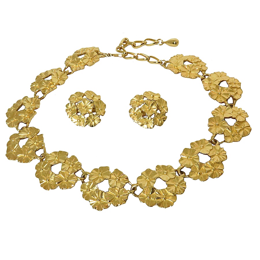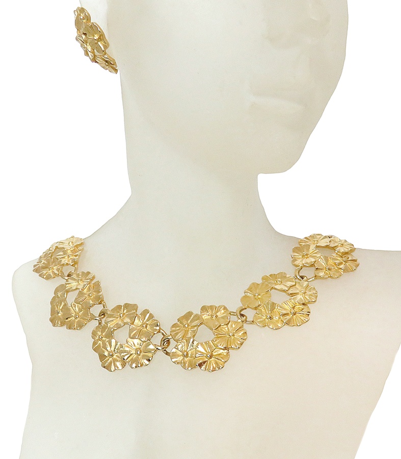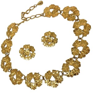 Vintage Trifari high end designer collier met bijpassende clip oorbellen. De set is gemaakt van goudkleurig metaal. Iedere schakel van het collier heeft 5 bloemetjes en de oorbellen hebben er 7. Het collier is verstelbaar en sluit met een haakje. Zowel de oorbellen als het collier zijn gesigneerd. Deze set dateert uit de 80er jaren en weegt samen 93,9 gram (collier weegt 80,2 gram en de oorbellen 13,7 gram). Heel elegant en een echt statement.