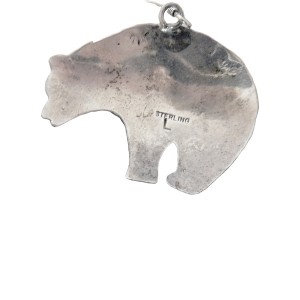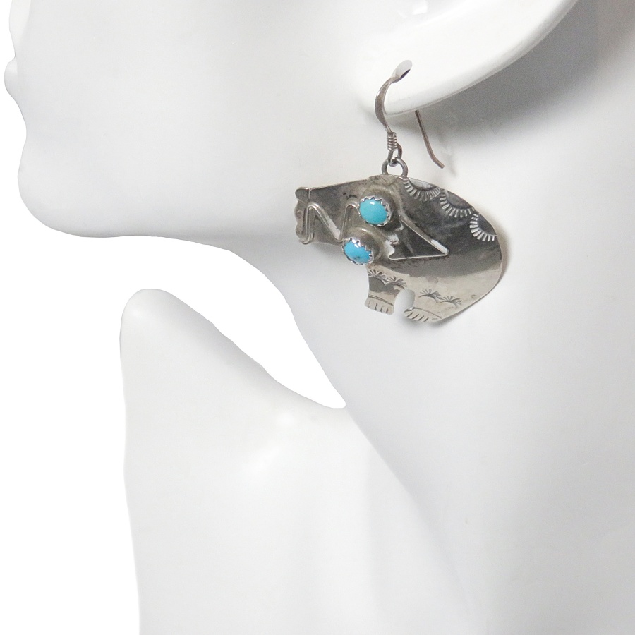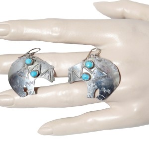 Fraaie en grote sterling (= 925) Navajo Indiaanse zilveren beer oorbellen met ronde turquoise cabochons. Deze vintage oorbellen zijn handgemaakt door Jeff Largo te New Mexico. Het hart van het Zuid Westen. De beer zou volgens de Navajo cultuur een sterke beschermende functie hebben. Ze dragen zeer comfortabel en wegen samen 8,1 gram.