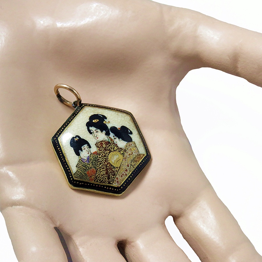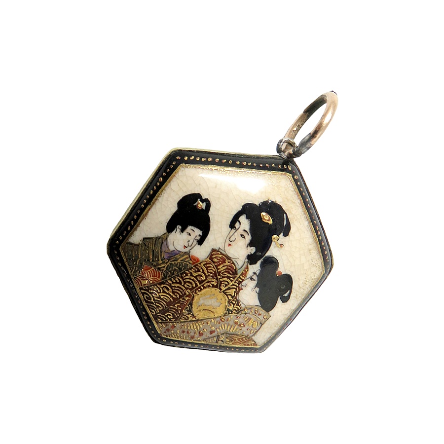 Zeer mooie antieke Victoriaanse, handbeschilderde porseleinen Satsuma Japanse hanger met een vergulde zilveren achterkant. Satsuma is een provincie van Japan. De typische klei die in deze provincie werd gevonden, wordt gebruikt voor het beroemde Satsuma porselein. Deze broche is een typisch Satsuma exemplaar dat werd gemaakt in de Meije-periode (1868 tot 1912). Het merkteken op de achterkant van deze hanger lijkt afkomstig te zijn van de machtige Japanse familie Shimazo-shi. Ik ben er vrijwel zeker van dat het porselein is gezet in echt verguld zilver, maar ik weet niet welke zilverkwaliteit het is. Het is als zodanig getest. De voorkant is handbeschilderd met typisch Japanse dames. De conditie is uitzonderlijk goed met wat zeer lichte slijtage en scheurtjes veroorzaakt door de leeftijd. De achterkant heeft wat vlekken. Het is een echte schoonheid en weegt 12,1 gram.