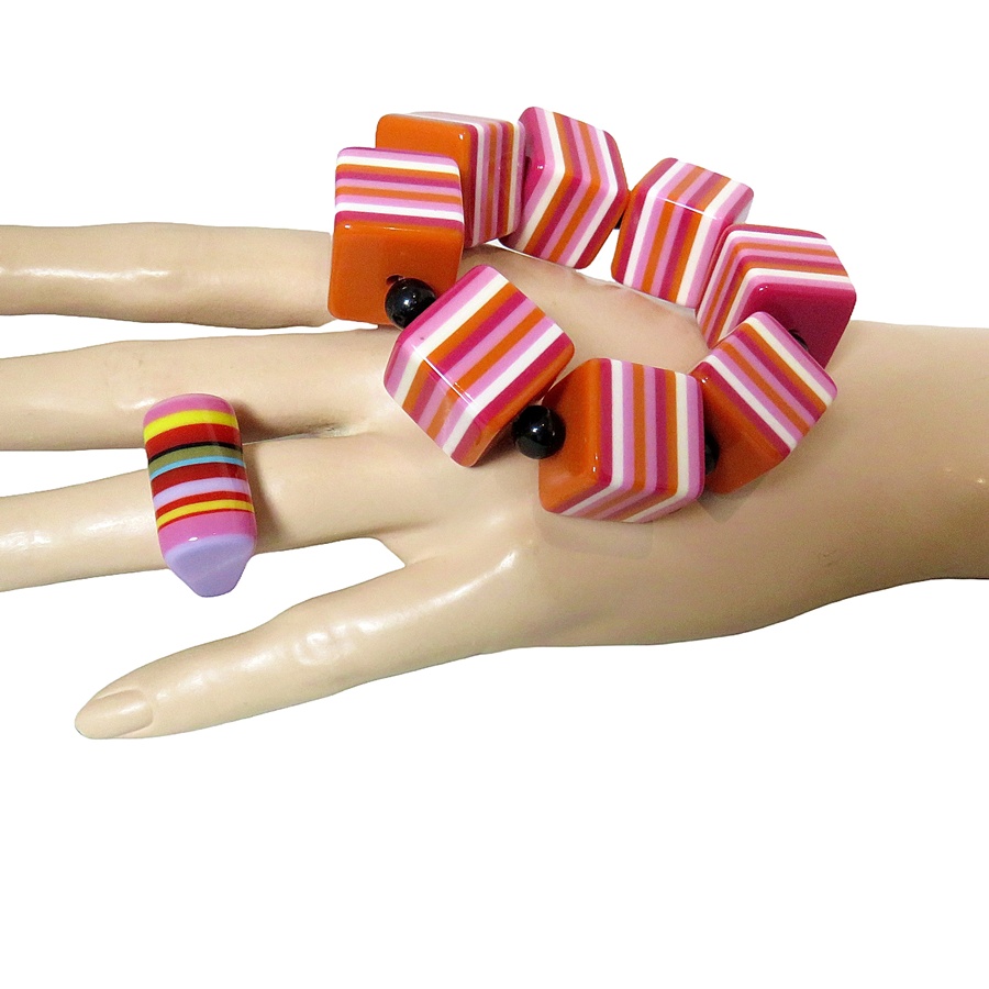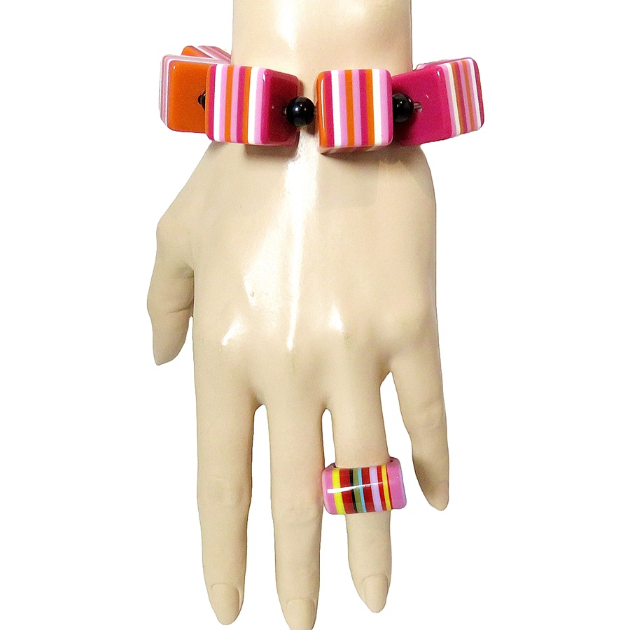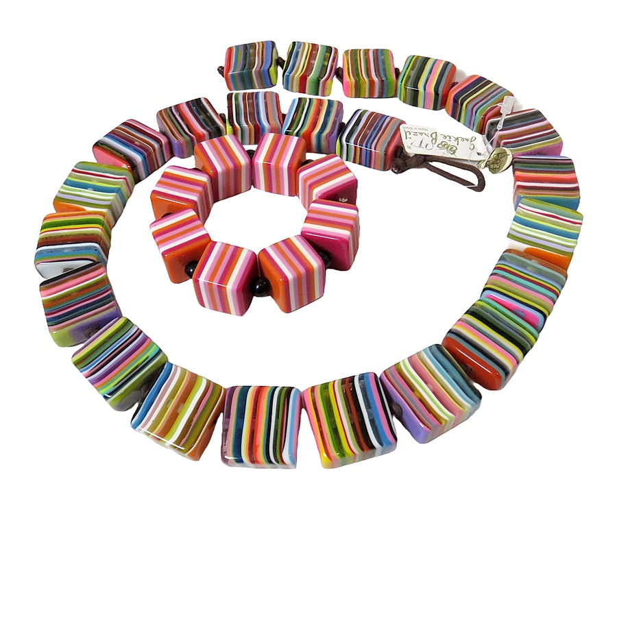 Bijzondere vintage Pop-Art sieraden set van Braziliaanse top ontwerper Carlos Sobral uit de Jacky Brazil lijn. De set bestaat uit een zware kwaliteit collier met een rekbare armband en een ring. Alle stukken bestaan uit de typische kleurige resin (hars) onderdelen waar Sobral zo beroemd mee is geworden. Jackie Brazil is het merk/de lijn/ de naam voor zijn collectie harssieraden. De stukken staan bekend om hun unieke, handgemaakte en vaak gerecyclede materialen. Het collier weegt 197 gram, de armband 65,5 gram en de ring 4,5 gram.