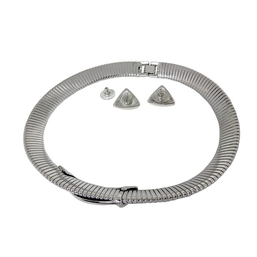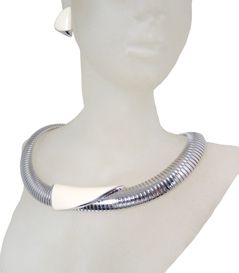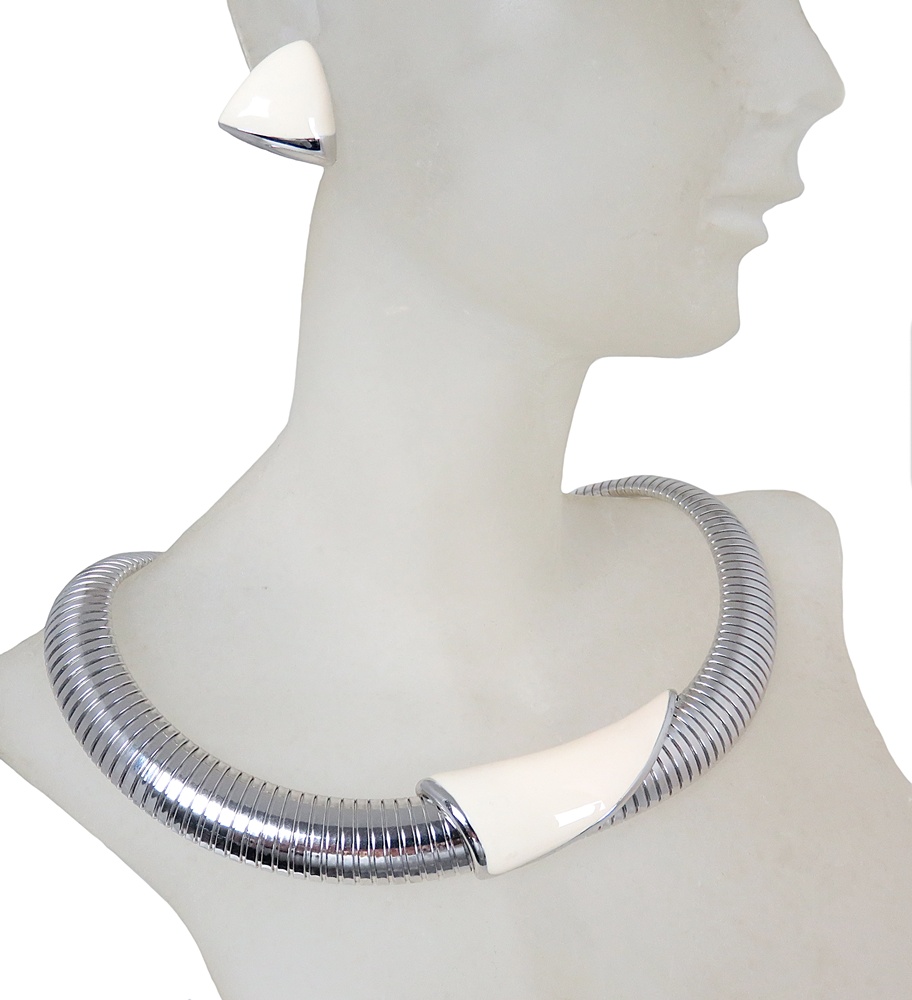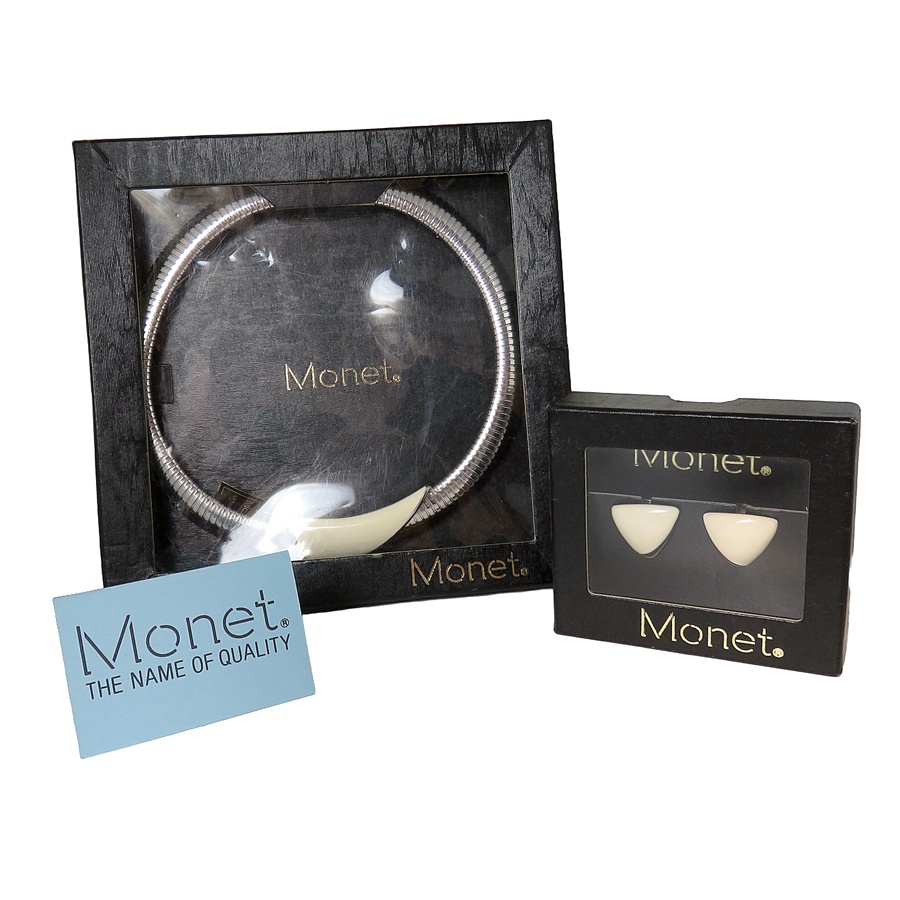 Bijzondere zware kwaliteit vintage Monet designer collier / choker met bijbehorende steek oorbellen. Het collier bestaat uit een brede, zilverkleurig slangen (omega) ketting met een driehoekig gevormd siergedeelte met beige kleurig emaille. De driehoekige zilverkleurige oorstekers zijn ook voorzien van beige emaille. Deze set heeft een prachtige klassieke chique uitstraling en komt in zijn originele dozen. Het plastic van de deksel van de doos met het collier heeft lichte beschadigingen. Het collier valt soepel om de hals. Zeer stijlvol! De oorbellen wegen 10,5 gram samen en het collier weegt 70,3 gram. Design uit de 80er jaren.