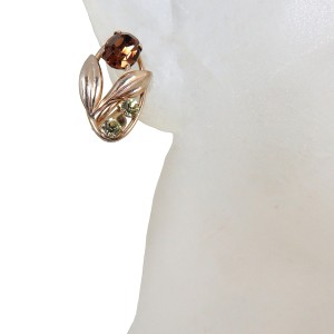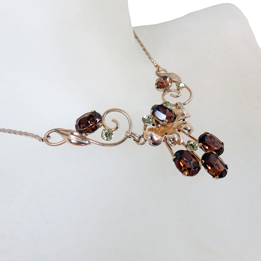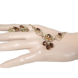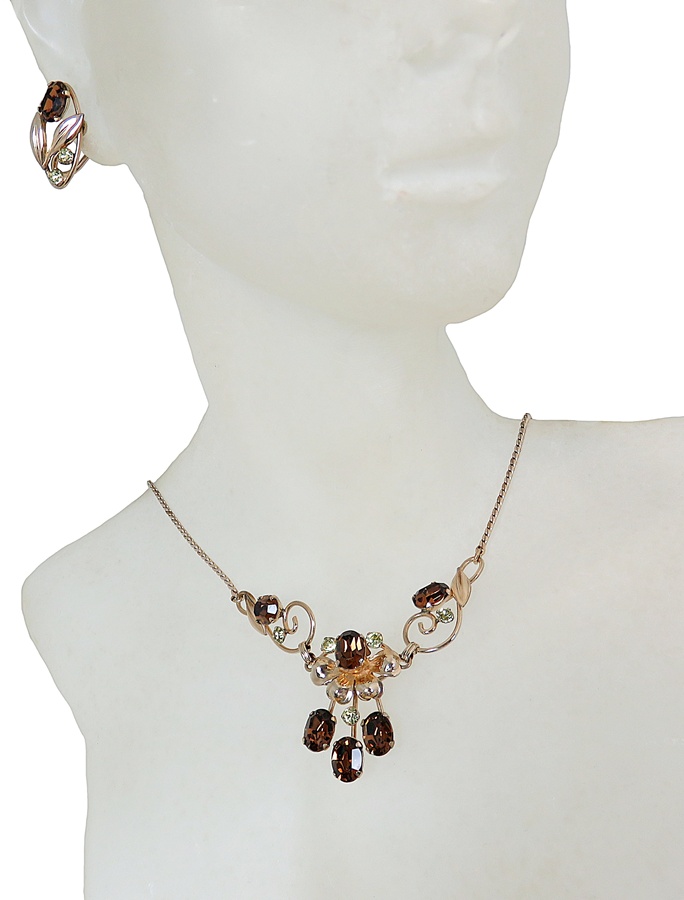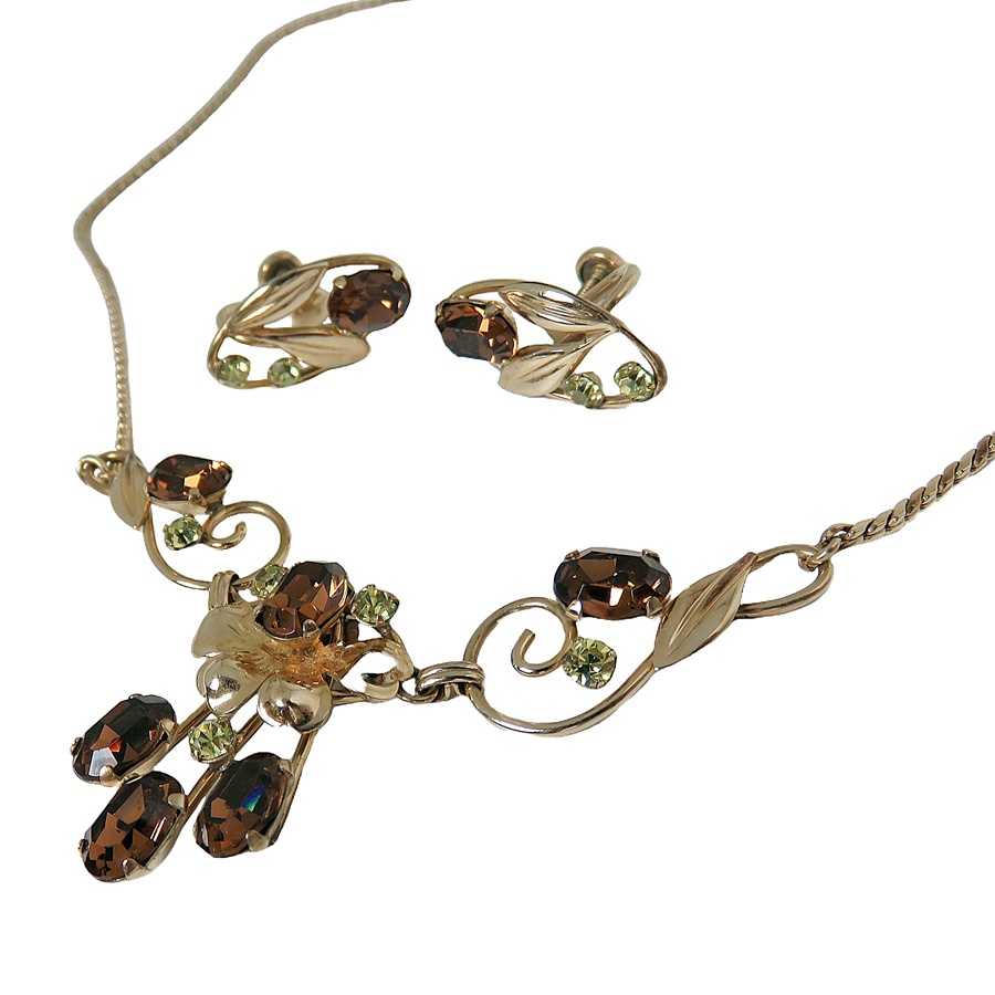 Zeldzame vintage Van Dell collier met bijpassende schroef oorbellen. In deze set zijn amber kleurige facet geslepen glasstenen en kleinere rond licht groen kleurige facet geslepen glasstenen verwerkt. Doordat deze set van hoogwaardig 1/20 12 karaat gold filled materiaal is gemaakt, voelt en draagt het als goud. Het is zeer verfijnd uitgewerkt. Een Amerikaanse licht gewicht set dat in de 50er - 60er jaren is gemaakt. Het collier weegt 9 gram en de oorbellen 3,8 gram samen.