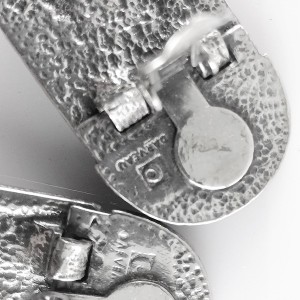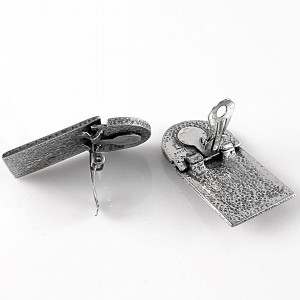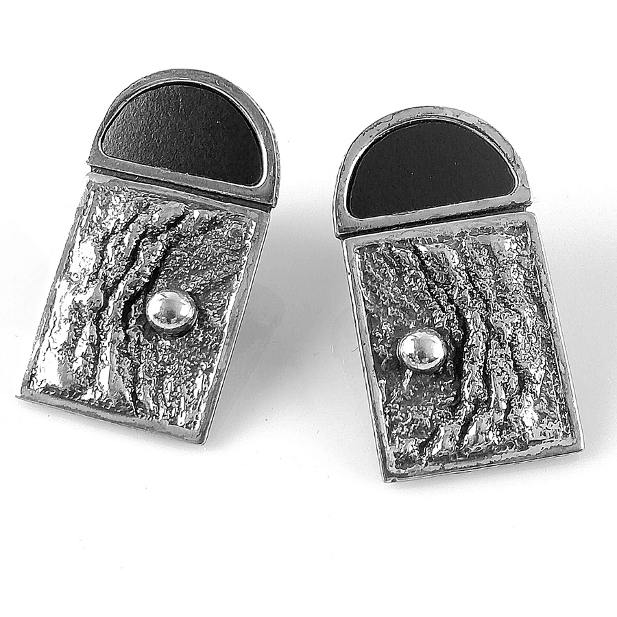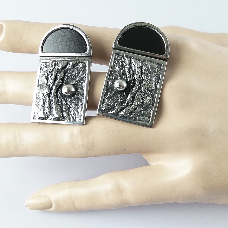 . Zeer fraai vormgegeven Modernistisch design uit de 60er jaren. De oorbellen bestaan uit twee scharnierende delen en zijn gemaakt van tin met een stukje zwart materiaal. Het gezamelijk gewicht bedraagt ongeveer 25 gram