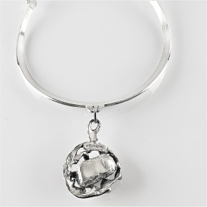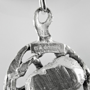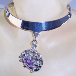 Zeldame verzilverde handgehamerd spang collier met hanger met ruwe Amethist van de Deense designer Erik Dennung voor Buch en Deigmann. Het is een abstract, futuristisch, minimalistisch, brutalistisch ontwerp en zeer chique. Het dateert uit de jaren zeventig. Het weegt ongeveer 91 gram en de spang is licht verstelbaar.