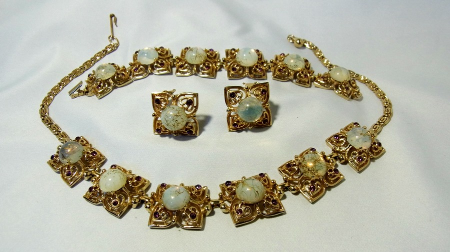 Vintage goudkleurig metalen sieraden set (collier, armband en clip oorbellen) met aparte handgeblazen glasstenen met een soort moonglow. Iedere steen is verschillend. De stenen zijn prongset en wittig doorzichtig van kleur met goudkleurige aderpatroontjes erop. Op iedere hoek van de schakels is een paars strass steentje geplaats. Een erge aparte set die waarschijnlijk uit de 60er jaren afkomstig is. De armband weegt 43 gram, de oorbellen samen 15 gram en het collier 61 gram. Erg leuke set voor de feestdagen.