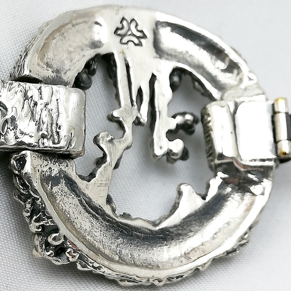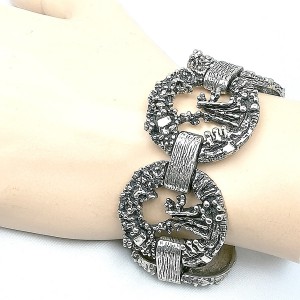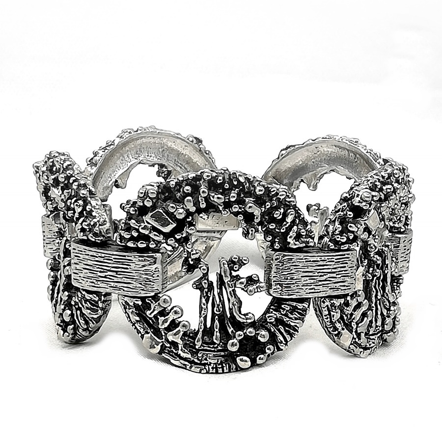 Prachtige zilverkleurige tinnen handgemaakte armband van de Canadese topdesigner Guy Vidal. Een zeer fraai modernistisch design uit eind 60er begin 70er jaren. Een topstuk en een echt statement. De armband bestaat uit vijf grote robuuste organische gevormde schakels en het gewicht bedraagt ca. 93 gram.