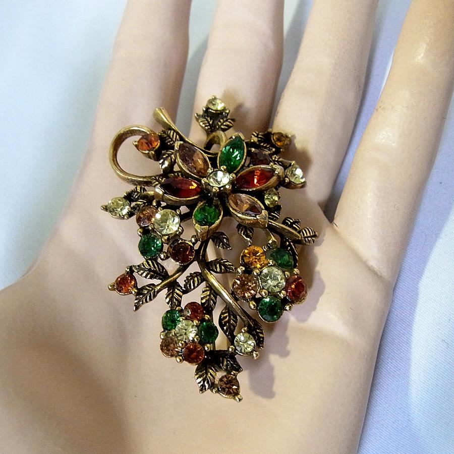 Chique vintage Coro designer broche uit de 50er of 60er jaren. Deze elegante Amerikaanse broche heeft de vorm van vele takjes met bloemen. De tak is uitgevoerd met een oud goudkleurige vergulding en de bloemen zijn bezet met facet geslepen glasstenen in de kleuren groen, cognac, lichte bruintinten en licht geel. Het heeft een zeer verfijnde exclusieve uitstraling, het weegt ruim 22 gram en heeft een goed werkende veiligheidssluiting.