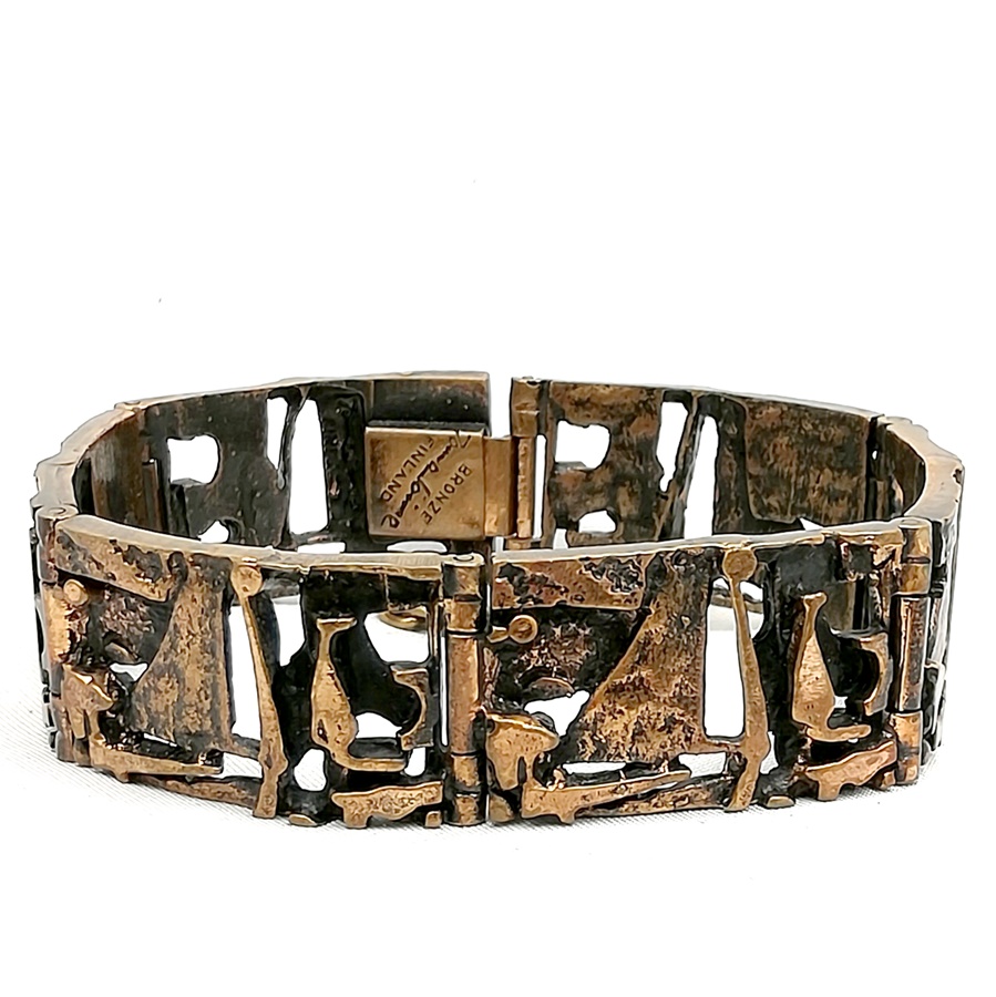 Unieke handgemaakte modernistisch bronzen armband van de Finse topdesigner Jorma Laine for Turun Hopea. Deze armband is in de 60er/70er jaren gemaakt en heeft een veiligheids ketting. Het weegt ca. 46,5 gram.