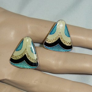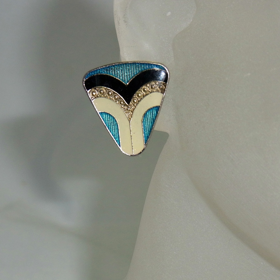 Prachtige vintage Pierrre Bex stijl designer clip oorbellen. Deze sierlijke Franse oorbellen hebben prachtige geometrische Art Deco emaille elementen in de kleuren crème, turkoise/blauw, zwart en goud. De achterkant is zilverkleurig. Ze wegen samen ongeveer 10 gram.