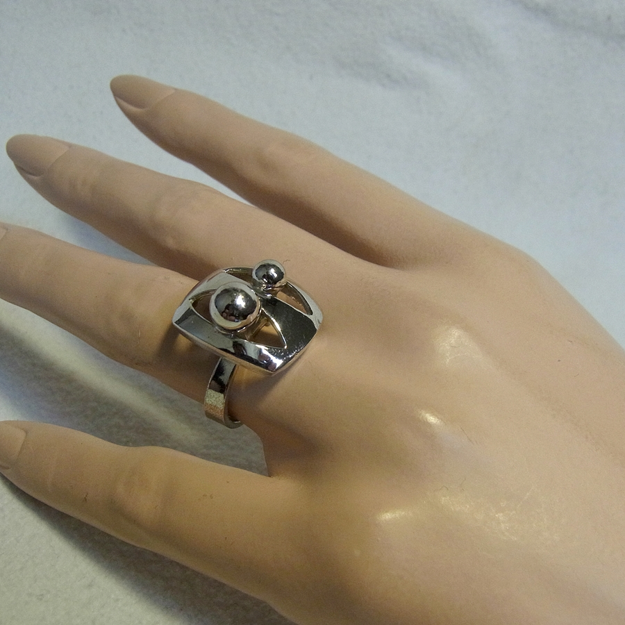 Unieke modernistisch 925 zilveren Space Age ring van het Duitse designermerk Unidor te Pforzheim Duitsland. De ring heeft een bijzondere organische vorm en in het midden zijn twee zilveren ballen aanwezig die van maat verschillen (een kleine met een diameter van 5 mm en een grotere met een diameter van 7 mm). Deze verstelbare ring is in de 70er jaren gemaakt en weegt 6,8 gram. Sieraden van deze designer zijn uiterst zeldzaam.