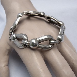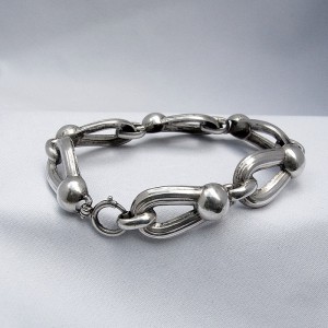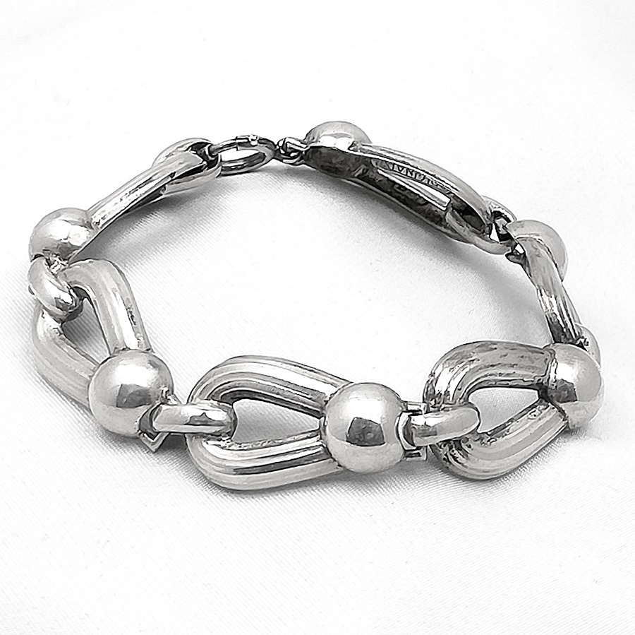 Zeer zeldzame en prachtige 935 zilveren modernistische armband van de Duitse designer Theodor Fahrner (Pforzheim Duitsland). Deze armband met 6 schakels is de 60er jaren gemaakt. Het bedrijf Fahrner creëerde in deze periode veel unieke modernistische sieraden en juwelen met prachtig detail en vakmanschap. Deze armband is mooi voorbeeld hiervan. Het weegt 27,3 gram.