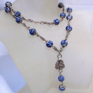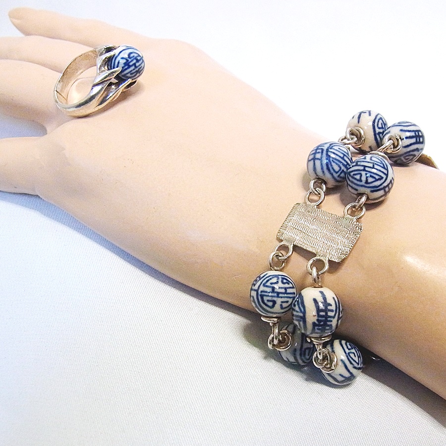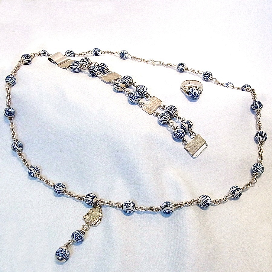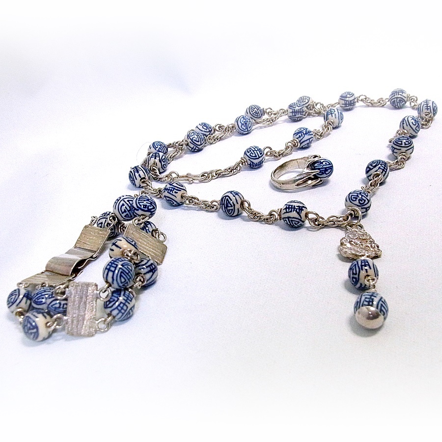 Oude vintage en fraaie handgemaakte sterling zilveren parure (collier, armband en ring) met blauw - witte Chinese export symboolkralen. Alle tussenliggende elementen en sluitingen zijn gemaakt van 925 (sterling) zilver. Deze aparte set is in de 60er jaren gemaakt en weegt samen 86 gram.