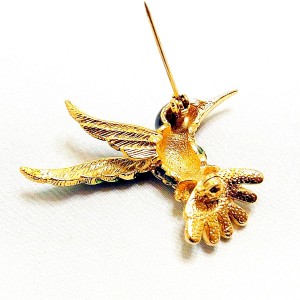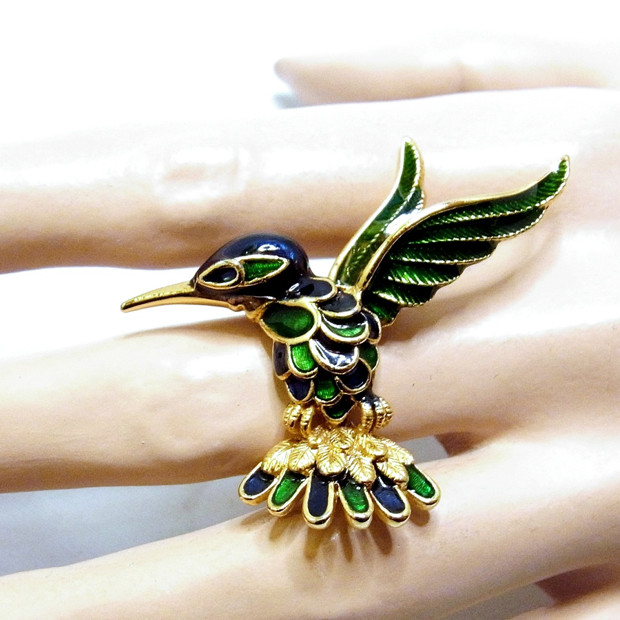 Prachtige elegante vintage Kolibrie (Hummingbird) broche. Deze broche is gemaakt van goudplated metaal met groen en blauw emaille. Het gewicht bedraagt 11,8 gram en het dateert waarschijnlijk uit de zeventiger jaren.