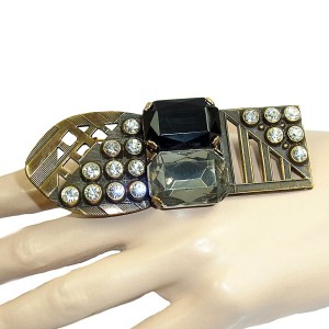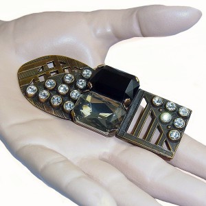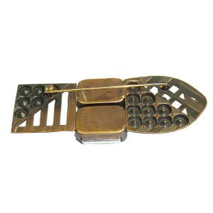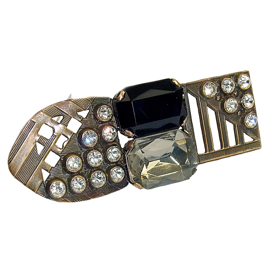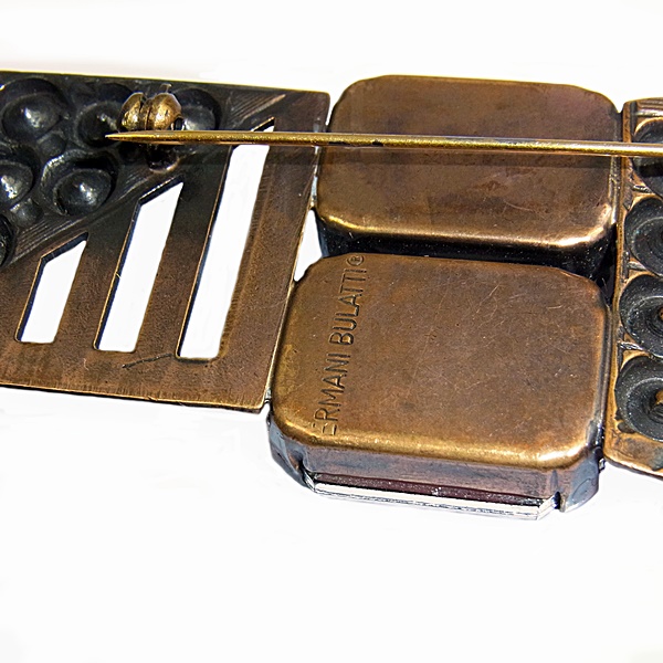 Grote vintage Ermani Bulatti bronskleurige designer broche. De broche is prachtig gedecoreerd met een grote rechthoekig gefacetteerde zwarte kunststof steen en een heldere gefacetteerde kunststof steen. Het gewicht bedraagt 30,5 gram.