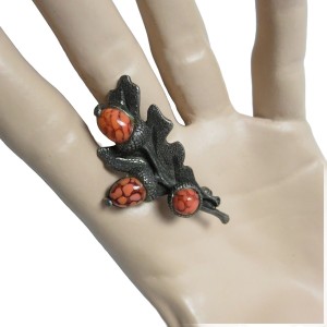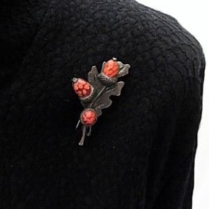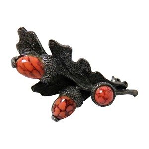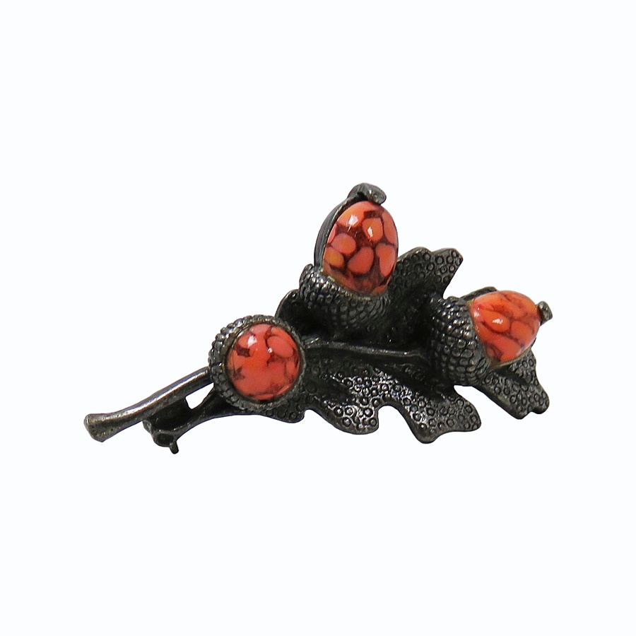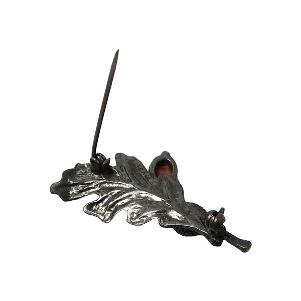 Zelzame en vroege vintage zilverkleurig tinnen Miracle designer broche dat een eikenblaadje met 3 eikeltjes erop voorstelt. Het is voorzien van een goed werkend veiligheidssltotje, weegt 11,1 gram en is in de 50er of 60er jaren gemaakt.