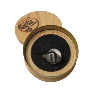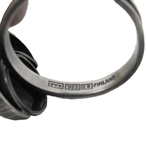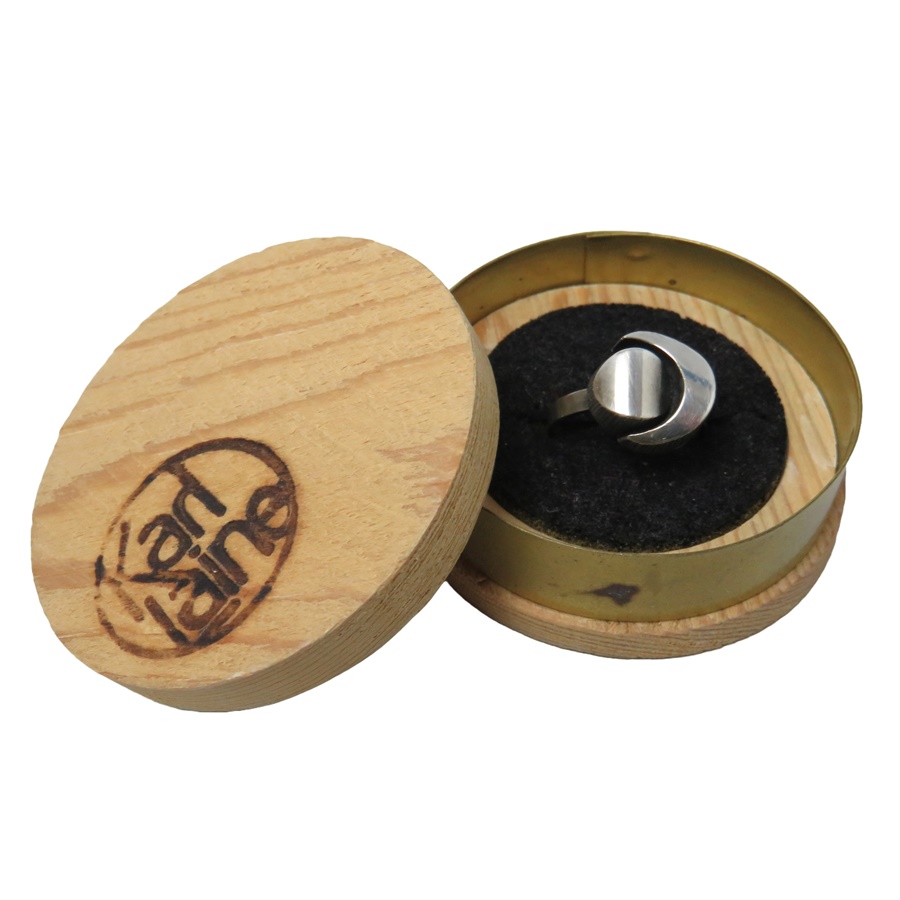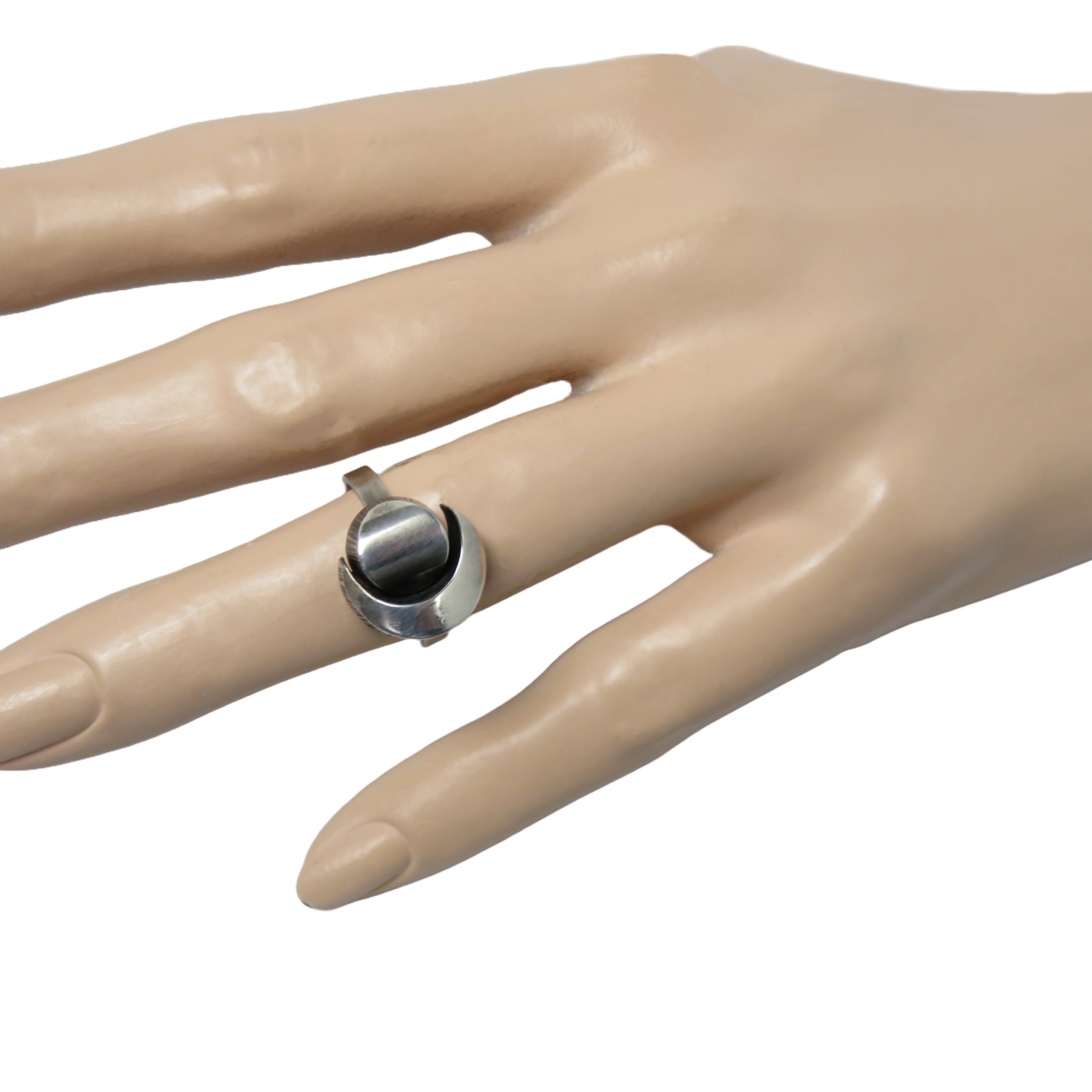 925 Zilveren verstelbare ring van de Finse designer Karl Laine (Finnfeelings) in zijn originele ronde houten doos gemerkt met Karl Laine. De ring is volledig gemerkt, dateert uit 1982 en weegt ongeveer 3 gram.