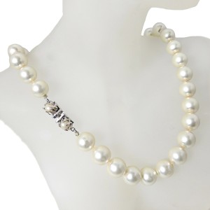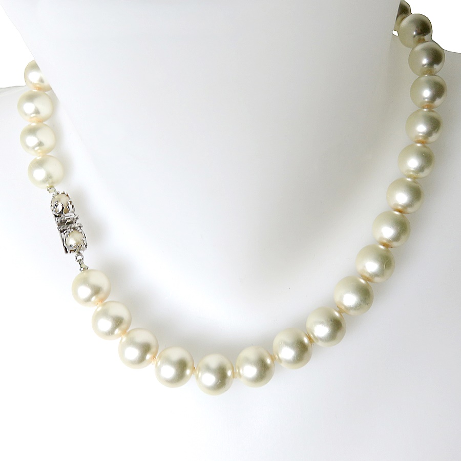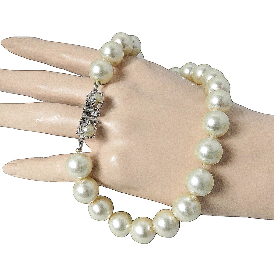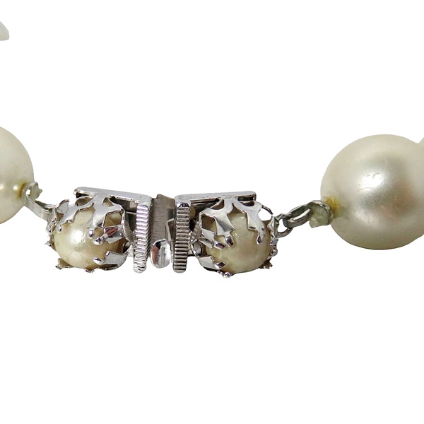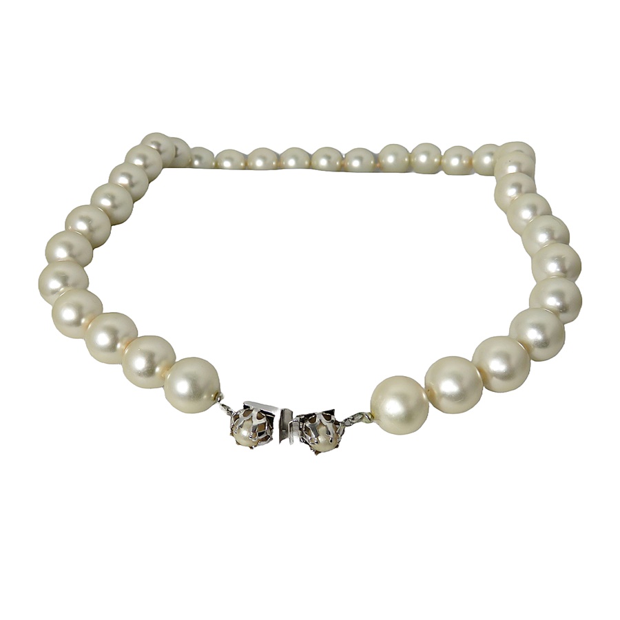 Unieke en zeldzame vintage Christian Dior parel collier uit 1961. Dit elegante en sierlijke collier heeft een zilverkleurig slotje waarin 2 kleinere faux pareltjes aanwezig zijn. Het straalt door zijn eenvoud. Het heeft 34 faux parels en weegt 78,7 gram.